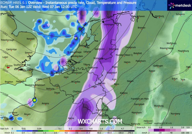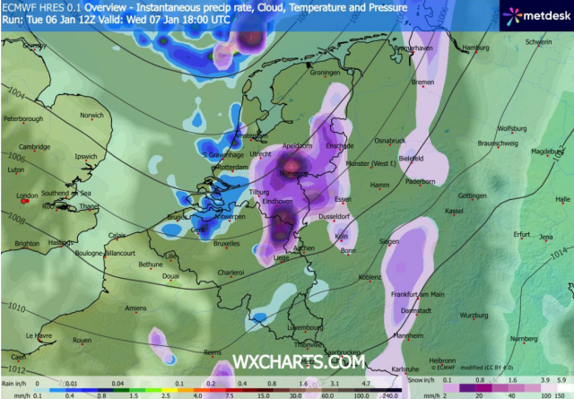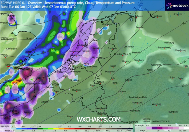 Woensdagnacht en woensdagochtend 7 januari dient zich een sneeuwzone aan vanaf het westen. In de nacht van dinsdag op woensdag kan er her en der al wat lichte sneeuw of motsneeuw vallen voor het front uit, maar veel stelt dit nog niet voor. Het koufront trekt in de loop van woensdagochtend via het westen de Benelux binnen en wint tijdelijk aan activiteit. Daardoor zal er enige tijd matige, tot soms zelfs intense sneeuw kunnen vallen. Door de hoge sneeuwintensiteit zal het kwik tijdens de sneeuw dalen tot rond het vriespunt. In de westelijke delen kan het kwik nipt positief zijn met 0 à 1°C, maar verder landinwaarts kan het aanvankelijk nog vriezen of ligt het kwik rond het nulpunt. Daardoor kan de sneeuw ook blijven liggen en accumuleren.