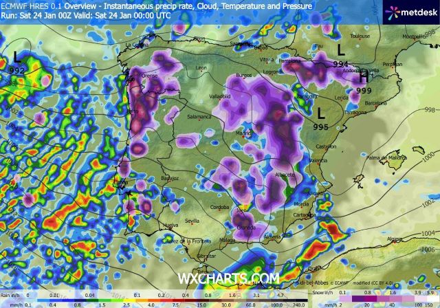 De sneeuwgrens blijft laag: 300 tot 500 meter in grote delen van Noord-Spanje en 600 tot 800 meter in de rest van het land. Sneeuw kan opnieuw vallen in laaggelegen gebieden van Galicië en zelfs in het centrum van het schiereiland. In de Pyreneeën sneeuwt het vanaf 800 tot 1.000 meter.