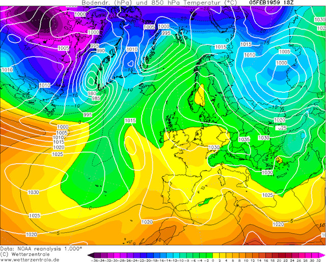 Heerlijke schaatscondities al met al, die vanwege de aanlandige wind tot een triest einde kwamen toen een nieuw hogedrukgebied boven de Britse Eilanden de regie overnam. In Arnhem waar ik toen woonde dooi. Verder naar het zuiden keerde de lichte vorst nog wel kort terug.