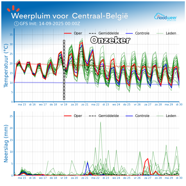 Ook in de weerpluim wordt die onzekerheid richting volgend weekend duidelijk. Zowel op vrijdag, zaterdag als zondag zijn er weermodellen die de temperatuur eerder rond 20 graden houden, maar er zijn ook weermodellen die met maxima van meer dan 25 graden komen. Het blijft daarbij in eerste instantie droog, maar vanaf zondag neemt de wisselvalligheid opnieuw tijdelijk toe. Van een droger intermezzo is dus helemaal geen sprake.