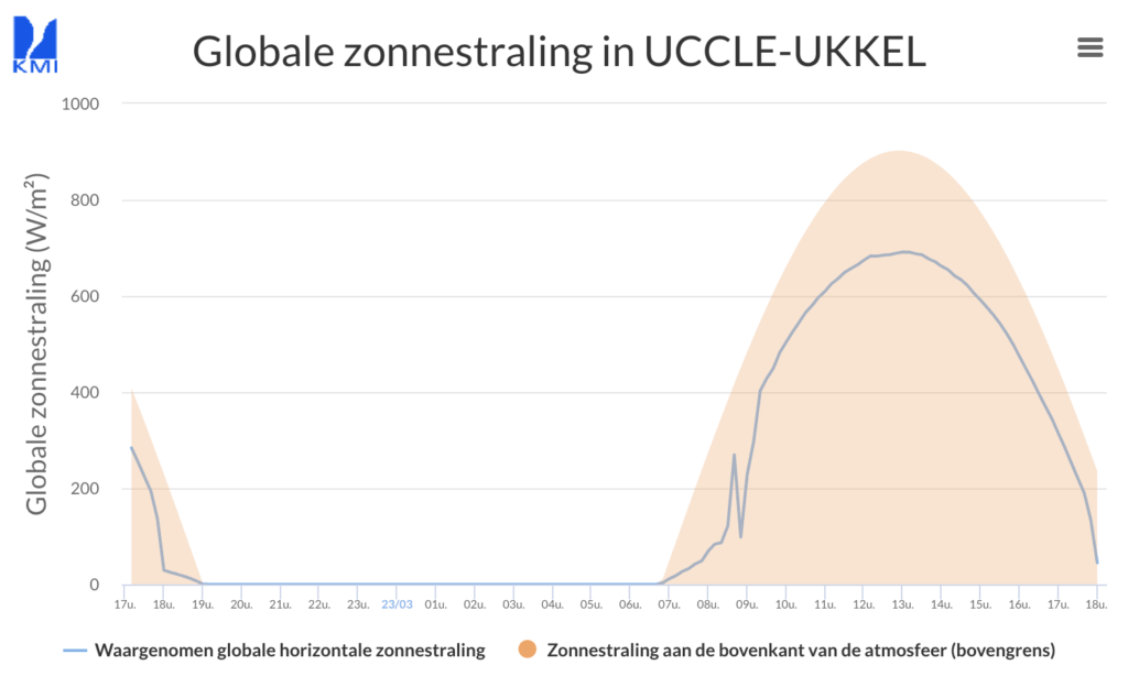 De zon schijnt dus meer dan 12u momenteel en dat bij frisse tot normale temperaturen. Bovendien staat er een goed voelbare oostenwind die de zonnepanelen extra koel houdt. Zonnepanelen geleiden elektriciteit immers beter bij koudere temperaturen. Zo wordt er vaak aangehaald dat de opbrengst van zonnepanelen daalt met 5% voor elke 10°C.We kunnen dus besluiten dat het voor de zonnepanelen momenteel ideaal weer is (zonnig en fris) maar dat we nu in maart omwille van de nog eerder lage zonnestand geen recordopbrengst zullen krijgen. Koude, zonnige dagen in april en mei brengen meestal nog meer op.