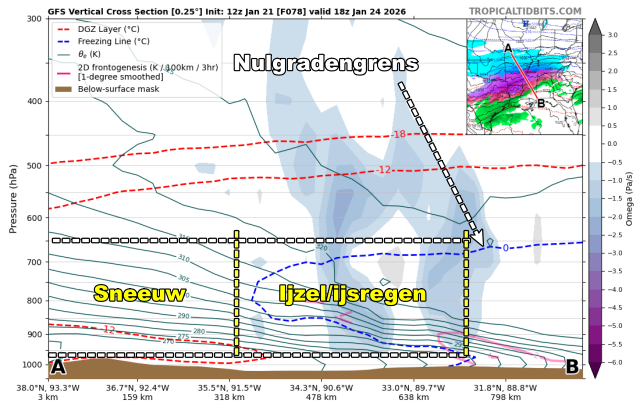 Zachte lucht is lichter dan de koude lucht, dus de zachte lucht weet op hoogte verder door te dringen naar het noorden dan de zachte lucht aan de grond. Daardoor blijft het vriezen op neushoogte, terwijl het op een kilometer hoogte veel warmer is. Gevolg: de sneeuw smelt op hoogte en kan in de onderste lagen opnieuw bevriezen. Er ontstaat onderkoelde regen of ijsregen en wanneer die op een bevroren ondergrond valt, vriest die terug aan met ijsafzetting op grote schaal. Op onderstaande figuur is de blauwe stippellijn de nulgradengrens. We zien dat de zachte lucht op hoogte inderdaad verder noordelijk kan doordringen dan aan de grond met op grote schaal ijzel of ijsregen.
