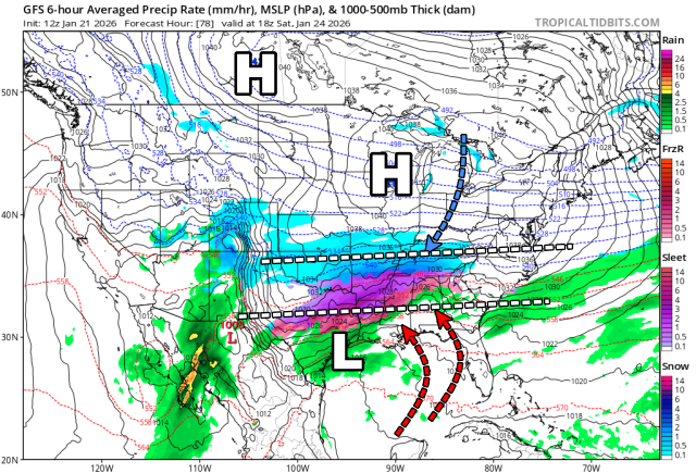 In de loop van zaterdag, onze tijd, probeert een lagedrukgebied vanuit Mexico richting het noordoosten te trekken. Aan de voorzijde van het systeem wordt op hoogte zachte lucht aangevoerd. Met die zuidelijke stroming kan ook veel vocht vanuit de Golf van Mexico naar het noorden getransporteerd worden. Echter, een krachtig hogedrukgebied boven het centrale/noordelijke deel van de Verenigde Staten zorgt ervoor dat het lagedrukgebied niet naar het noorden kan trekken en dus afbuigt naar het noordoosten. Op het grensvlak (luchtmassagrens) ervan ontstaat een stevige neerslagzone met sneeuw, ijzel en/of ijsregen.