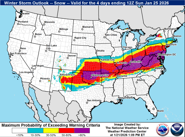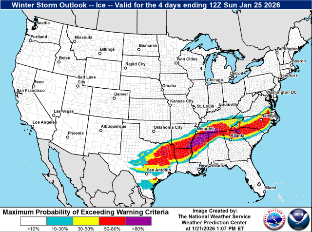 Dat er gevaren kunnen en zullen ontstaan spreekt voor zichzelf en dat wijst ook onderstaande kaart uit van onze Amerikaanse collega’s. Op grote schaal verwachten ze dat de waarschuwingsniveau’s zullen overschreden worden voor zowel sneeuwval als ijsafzetting. Op dit moment staat er dan ook al een winter storm watch uit die de bevolking moet voorbereiden op acties die ondernomen moeten worden. Een “echte” waarschuwing volgt pas later.