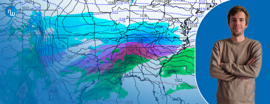 In de loop van zaterdag, onze tijd, probeert een lagedrukgebied vanuit Mexico richting het noordoosten te trekken. Aan de voorzijde van het systeem wordt op hoogte zachte lucht aangevoerd. Met die zuidelijke stroming kan ook veel vocht vanuit de Golf van Mexico naar het noorden getransporteerd worden. Echter, een krachtig hogedrukgebied boven het centrale/noordelijke deel van de Verenigde Staten zorgt ervoor dat het lagedrukgebied niet naar het noorden kan trekken en dus afbuigt naar het noordoosten. Op het grensvlak (luchtmassagrens) ervan ontstaat een stevige neerslagzone met sneeuw, ijzel en/of ijsregen.